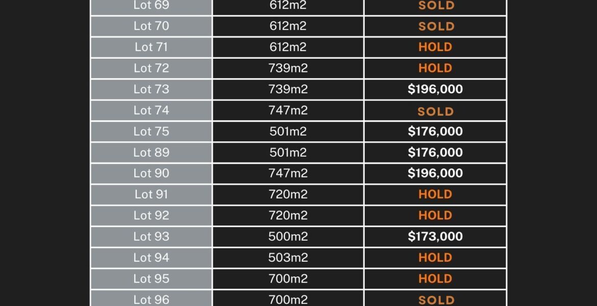 Prices starting from $173,000 and sizes ranging from 500m2 to 805m2.