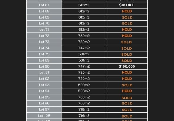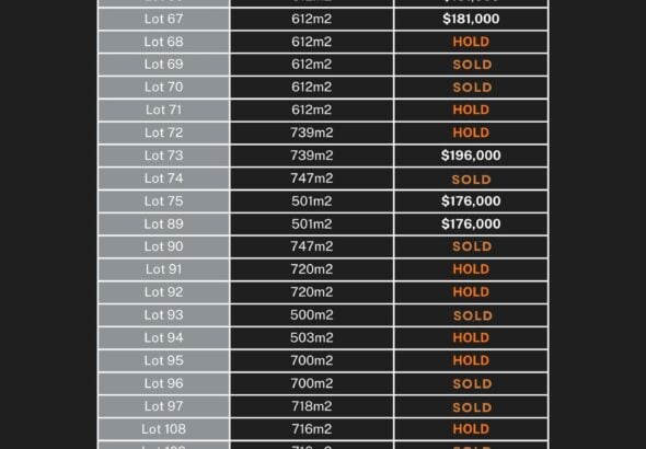 Prices starting from $173,000 and sizes ranging from 500m2 to 805m2.