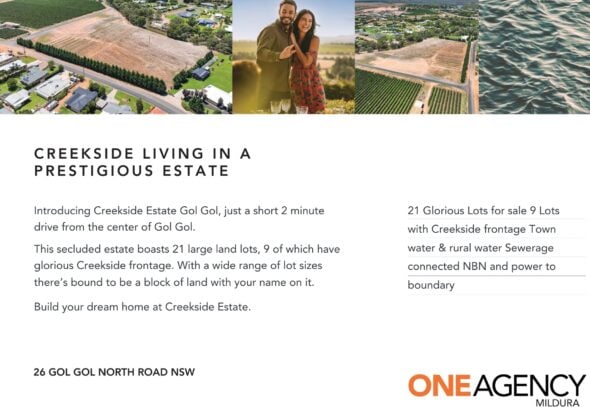 One Agency Mildura welcomes to the market, the long awaited… ‘ Creekside Estate’