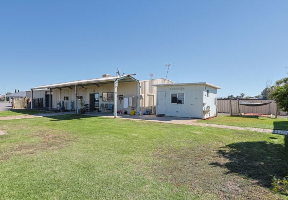 The property features a spacious 4-bedroom home designed for easy family living, boasting an open-plan layout, a modern kitchen with a gas cooktop and electric oven, and a central bathroom with separate toilet and laundry. An additional bedroom and outdoor room with an external toilet provide flexible living or guest accommodation.